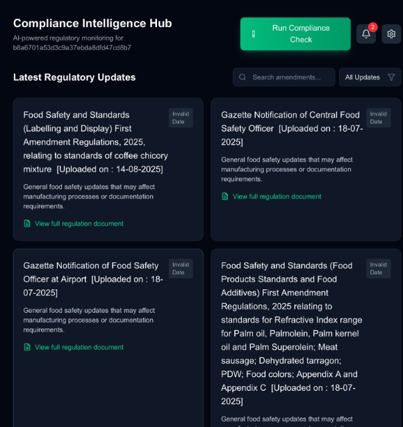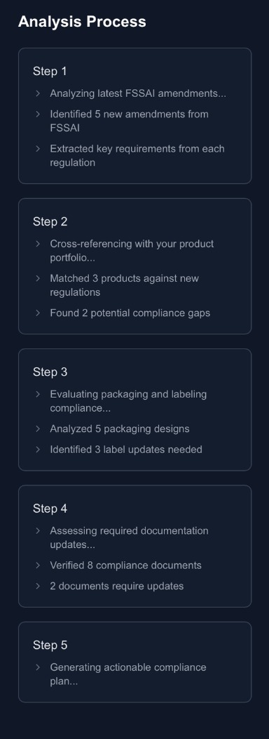 Automated scrapers for FSSAI, RBI, SEBI, Gazette, MCA — detecting new amendments instantly on publication.