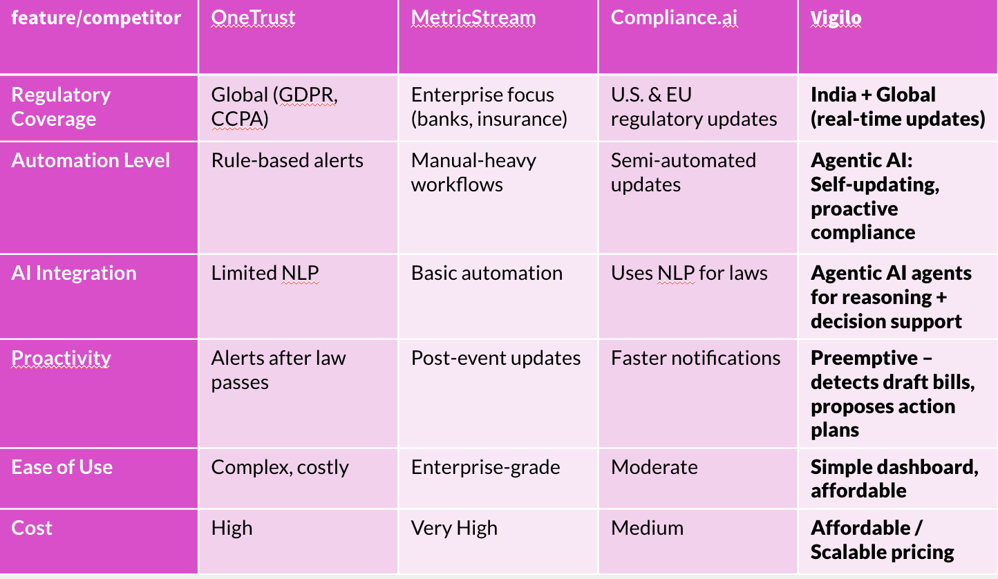 Regulatory compliance is a full-time job — Vigilo automates it. It continuously scrapes 5+ government portals (FSSAI, RBI, SEBI, Gazette, MCA) to detect new amendments the moment they're published, storing them as vector embeddings in ChromaDB for RAG-based retrieval.