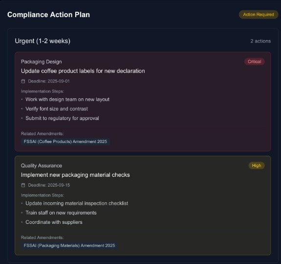 ↳ 3 relevant amendments retrieved via ChromaDB. Key impact: new labelling requirements for imported goods effective Q2 2025. Alert sent via SendGrid.