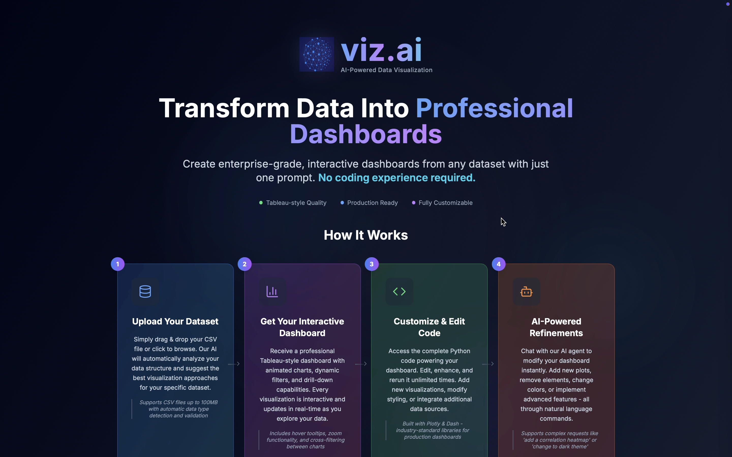 Upload any raw dataset — viz.ai handles everything else. A multi-orchestration LangGraph pipeline coordinates open-source LLMs to automatically select visualization types, detect patterns and anomalies, and generate a complete multi-plot analytics dashboard.